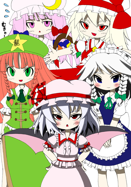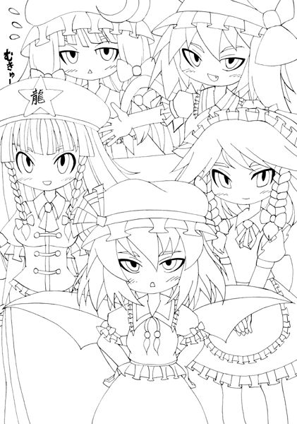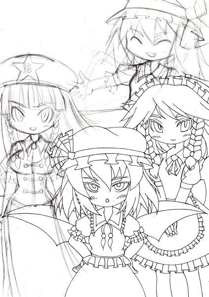 ⇒前描いた中ボスの集合絵が結構スカスカしていたので、今回はキャラを全員大きめに描いてキツキツにしてみようかと。フランが適当すぎるので後々直すかも。左上はむきゅーを入れるつもりです(要は紅魔館組で)