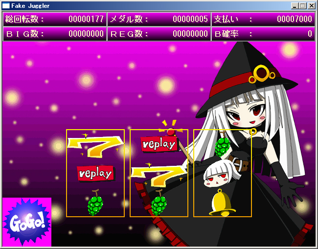 で、最近仕事なくて暇だったので、⇒こんなの作って遊んでました。仕様はインターネットでかき集めてきたジャグ●ーライクです(詳細部分は知らないので大体合っている感じ)ボーナスにはまっていない間は役がそろわないようにしたりとかかなり中は複雑なつくりにしてます、何気に今まで作ってきたお遊びアプリではトップクラスにアルゴリズムは複雑かも…。