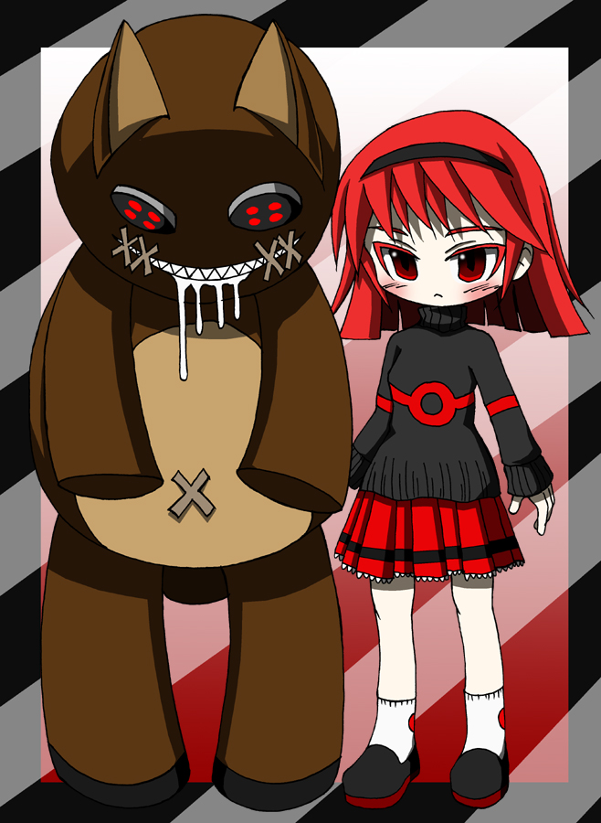 左のイングリッドは昔作ろうとしてたゲームで教師として出てきた大人バージョンなんですが、右のは子供の時の姿です。実は右のは10年位前に書いていたオリジナル小説の第一部で登場した最古のキャラの一人であるデンジャラスぬいぐるみという名前のぬいぐるみ(見た目のまま)と当時は名前の設定のなかった少女です。当時の資料が無いので漠然としか当時とデザインがあっていないですがとりあえずこんな設定なのです。