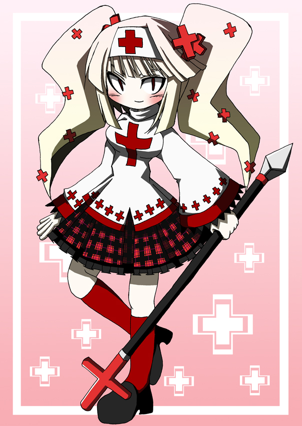 この娘は5年位前に当サイトで公開していたHP、攻撃力、守備力、素早さの4パラメータをキャラクタ毎に登録してランダムに戦闘させるJAVAアプレットに応募されたキャラクタです。髪の毛が黄色から桃色のグラデーションがかかったプリーストという設定で、「アイカ」という名前です。実はマァルのパズルの敵にも出てきたりします。この娘の衣装も当時とガラリと変えて描いてみました。少しナースっぽいイメージです、なんせ回復役なもので。顔が普段描く他の女の子キャラとわざと結構違う風に描いてまして、それがなんかお気に入りだったりしますwあとプリーストですが、かなりの怪力で格闘術が得意という脳内設定もあります(そんなのばかりだな)