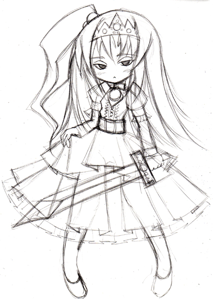⇒は覚えておられる方がいられるか大変不安ですが、マァルやシフォンなどのいる魔女界の女王のベル様です。一年前はこんな感じでデザインしてましたが、より女王様というかお姫様ちっくにこんなデザインに変更です。はじめ剣もってない絵でしたが、なんか寂しくて剣つけたら今度は余計な気がしてきました。明日あたりペン入れすると思うのでそのときつけるかどうか考えます。