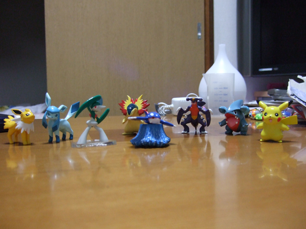 カイオーガ様は私の手持ちポケモンで最強なので購入、はじめシルエット的にそうでもなかったんですがだんだん好きになりました。今のインプと同じですwバクフーーーンはよく対戦している同僚との試合の時にあまりのヘボさぶりを発揮して以来ネタポケとしてフィーバーしたので購入(ヘボさとはかなり緊迫した試合の中降臨後、地面系ポケモンが相手にいるのにも関わらず何も考えず「穴を掘る」とやって「地震」をいつもの倍以上のダメージをくらった事)エルレイドはシルエットが好きなので購入、できればラルトス、キルリア、サーナイト姉妹も欲しかったんですが何故か彼しかなかったんですよね…。で最後にグレイシア嬢、サンダース嬢。これは萌え目的で買いましたwイーブイ進化系は本当に萌えですw残りの6体も欲しかったんですがさすがにお金がきついので特に好きな2体をゲット。